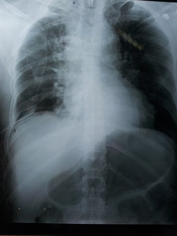 The above x-ray shows tension pneumothorax on the RT side and B/L Humerus fractures.