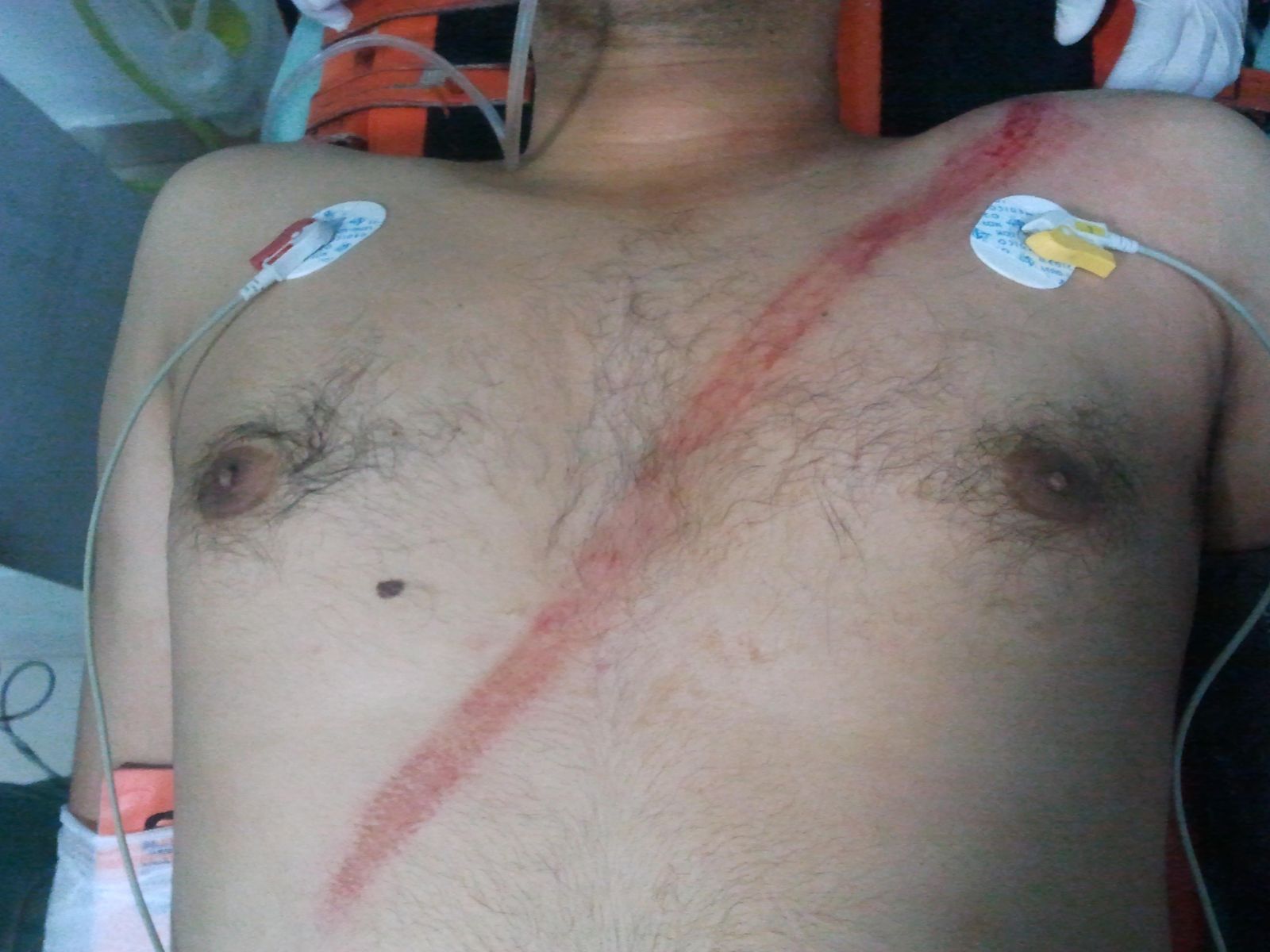 Above picture shows "seat-belt sign" over chest and abdomen of a 30 year old male involved in a road traffic accident,where a SUV crashed into a wall,killing the driver instantly.He was in the passenger seat and his life was saved only because he was wearing a seat-belt.