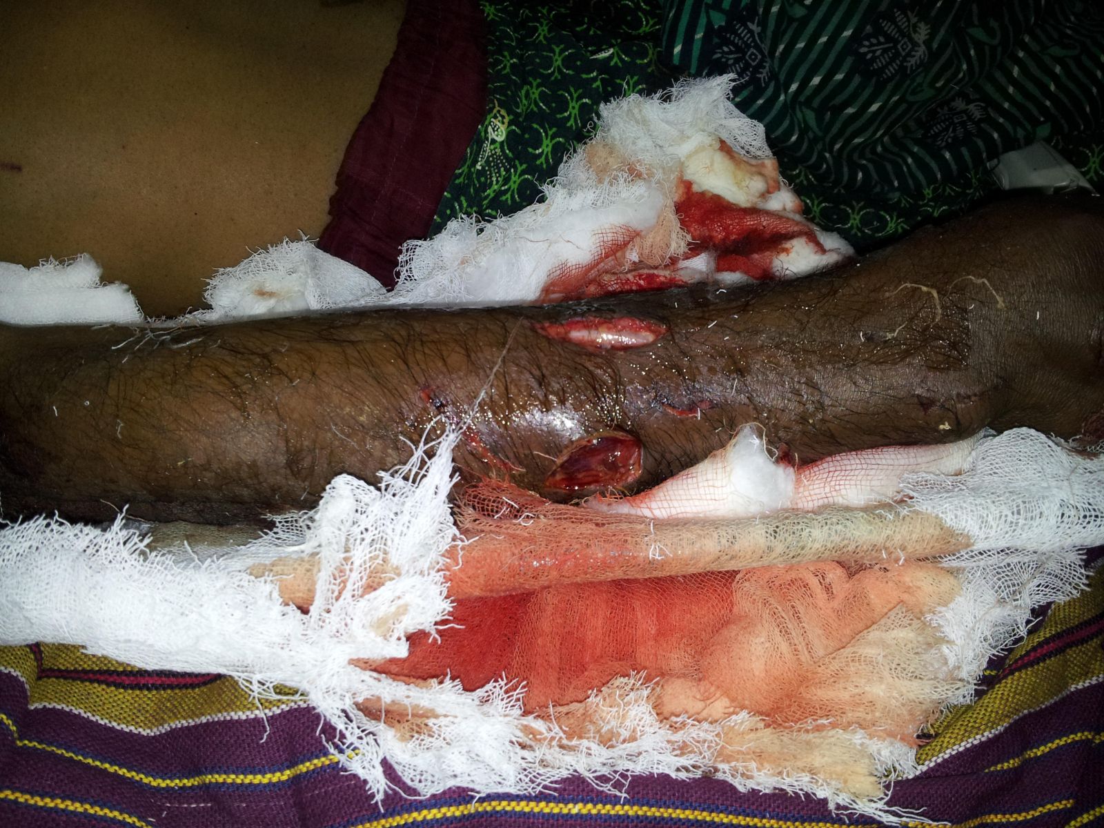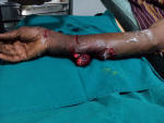 Extremities- Right forehand deformed with multiple puncture wounds with nonviable muscles protruding the wound. No radial and ulnar pulsations felt on rt upper limb. Decreased motor function of right fingers. Decreased sensations on right hand.