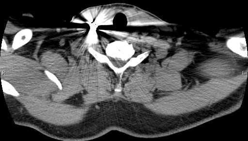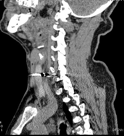CT Neck showed metallic foreign body piercing the right sternocleidomastoid muscle at the level of lower border of C6 vertebral body, likely abutting the carotid sheath at the level of lower border of cricoid cartilage on right side of neck. Soft tissue density anterior to IJV and CCA -likely haematoma