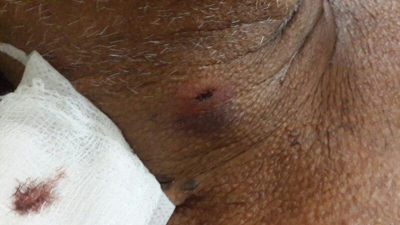 A 72 year old male presented to our emergency department with alleged h/o accidental gunshot injury. He reported having been shot in his neck. On arrival to ED he had stable vital signs. His primary survey was unremarkable, on exposure he had a small entry wound over the right side of neck in zone 2. E-FAST and Chest X rays were normal. He only complained of a small wound and mild pain over right side of neck which he sustained after an accidental gunshot injury with an airgun 2 hours back. There was no bleeding from the wound. He had no allergies. He was a known case of Type 2 DM, Hypertension and CAD on OHA, antihypertensive and antiplatelet.