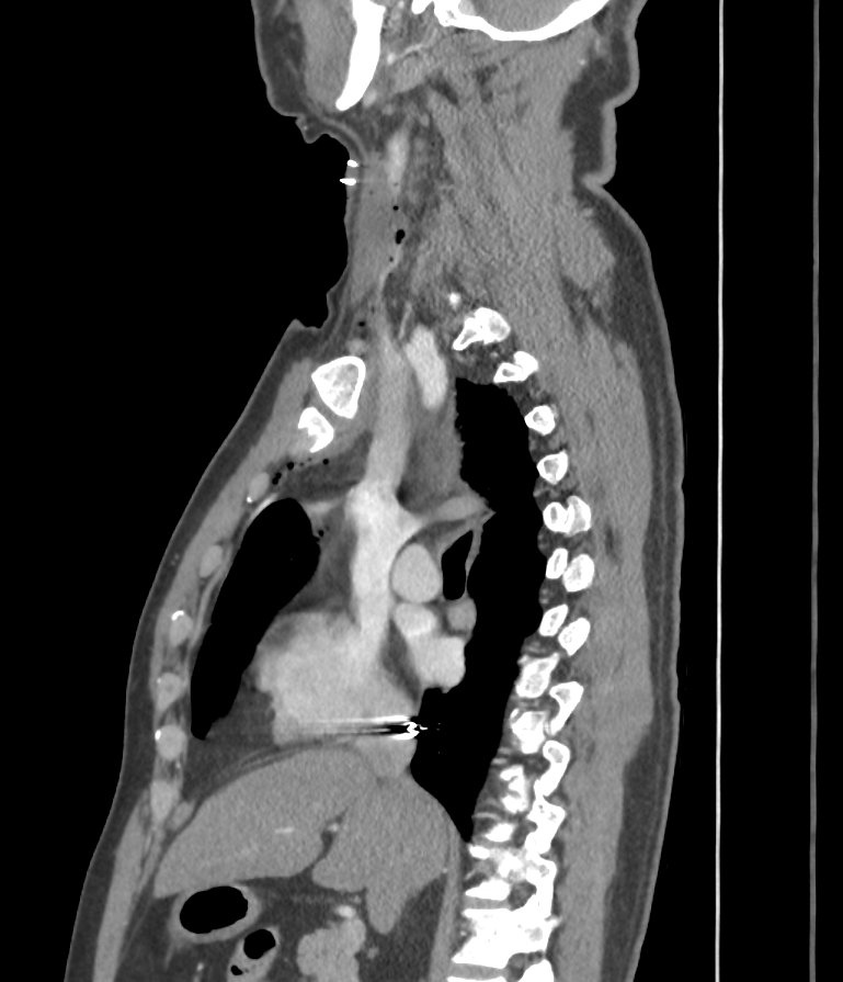 The patient was taken to OT the next day. Right neck was explored with vertical incision, there was a small haematoma around carotid sheath, but the FB was not located in the neck, C arm done showed the FB in thorax at the level of 4th rib. The neck wound was sutured and the patient was shifted to SICU.