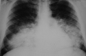 Bilateral symmetric alveolar opacities located centrally in mid and lower lung zones are typical, often in a "bat wing" distribution