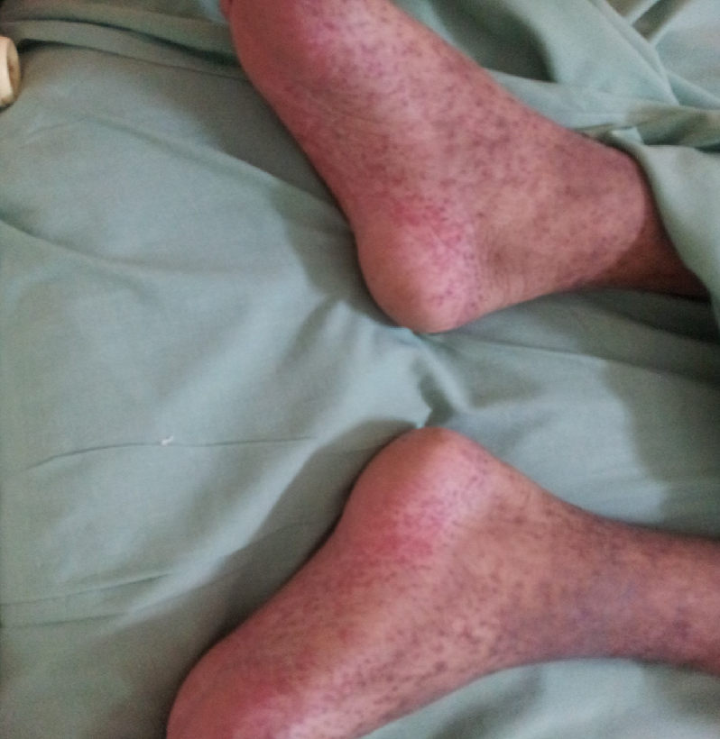 erythematous rash over both lower limbs, joint swelling
